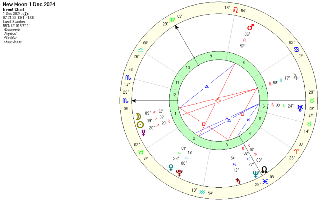 Första dagen i december är i år också första dagen i den nya måncykeln. Det är nymåne när månen och solen sammanfaller från jordens perspektiv. Månen gör sina varv ganska snabbt, det tar ca. 29,5 dygn. Solen rör sig med ca. 1 grad per dygn runt jorden (vi pratar här om astrologiska perspektivet, vilket är baserat på geocentriska modellen, alltså med jorden i centrum). På ett år är det ca. 12-13 nymåne fenomen.